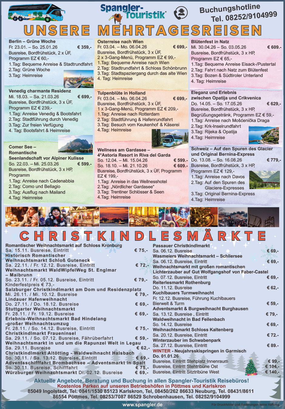 Unsere Reisebüros finden Sie in Ingolstadt, Neuburg, Karlskron, Schrobenhausen und Pöttmes.